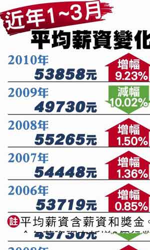 此外,台当局“主计处”昨公布1到3月受雇员工薪资调查,发现今年第一季平均薪资有5万3858元,比去年同期增加4128元,涨幅9.23%是18年来最高,但因金融海啸期间减薪太多,薪资未回到前年的水平。