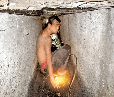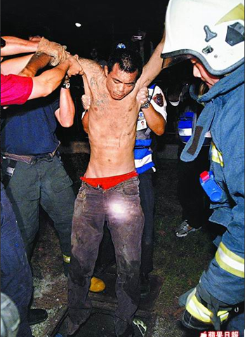 救援的警消无法钻入,只能将头伸入水沟内对他喊话。图片来源:台湾《中国时报》
