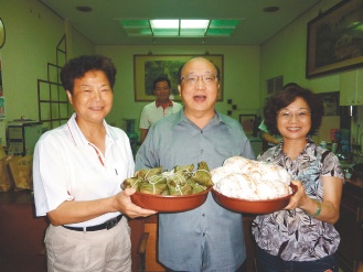 外埔乡长刘陈吻(左)昨天赠送包子与粽子给台中市长胡志强(中),让胡市长非常高兴。图片来源:台湾《联合报》