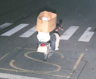 摩托车后座年轻人的上半身以纸箱套住,以为这样就能躲避查缉。 来源:台湾《联合报》