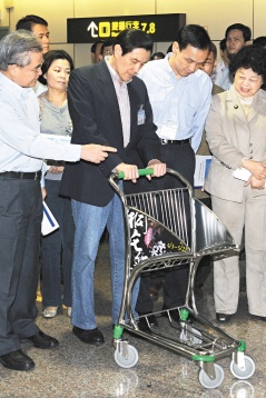 台湾知名制作人王伟忠曾撰文批评桃园机场行李手推车,数量不足又缺乏保养。马英九昨天特别到机场实际体验新推车的质量。图片来源:台湾《联合报》