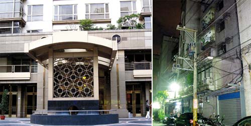 “富家男”温建和住在台北市的百达富丽豪宅(左图),自称身价数亿元,他的会计女友梁玉姗月薪四万元新台币,住在台北县三重市一栋旧公寓(右图),却侵占公款供他花用。图片来源:台湾《联合报》