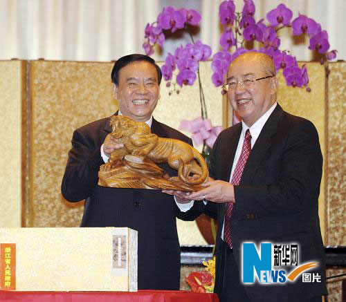 6月9日,中国国民党荣誉主席吴伯雄(右)在台北圆山大饭店与浙江省省长吕祖善互赠礼物。当日,浙江省长吕祖善率领的千人代表团抵达台北,开始进行为期一周的访问。图片来源:新华网