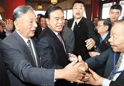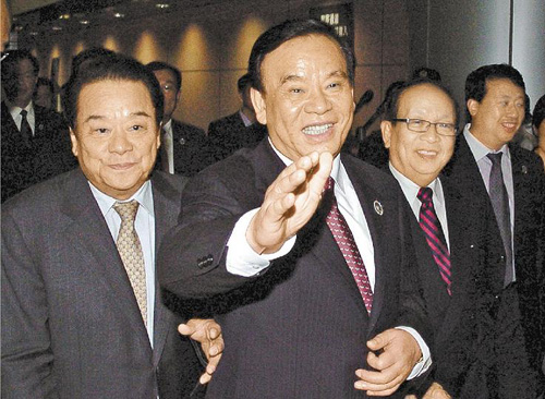 浙江省长吕祖善(中)9日率团搭机赴台访问。台湾工总理事长陈武雄 (左)和国民党副主席蒋孝严(右)前往接机。图片来源:台湾《旺报》