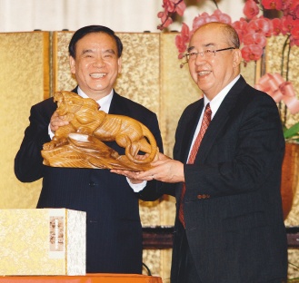 吕祖善(左)赠送虎型木雕给国民党荣誉主席吴伯雄(右)。图片来源:台湾《联合报》