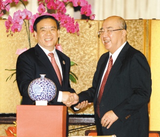 国民党荣誉主席吴伯雄(右)向吕祖善一行赠送台湾莺歌镇陶瓷当见面礼。图片来源:台湾《联合报》