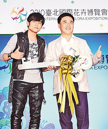 台北市长郝龙斌送周杰伦“城市之钥”,让他以后在台北取景畅行无阻。图片来源:台湾《中国时报》