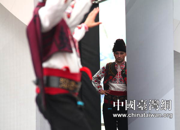 中国台湾网6月11日上海消息 6月11日,一名保加利亚舞者一边欣赏同伴的表演,一边等待上场。当天,来自保加利亚的Trakia歌舞团,在上海世博园欧洲广场为游客献上民族歌舞表演。(中国台湾网 田云鹏 摄)