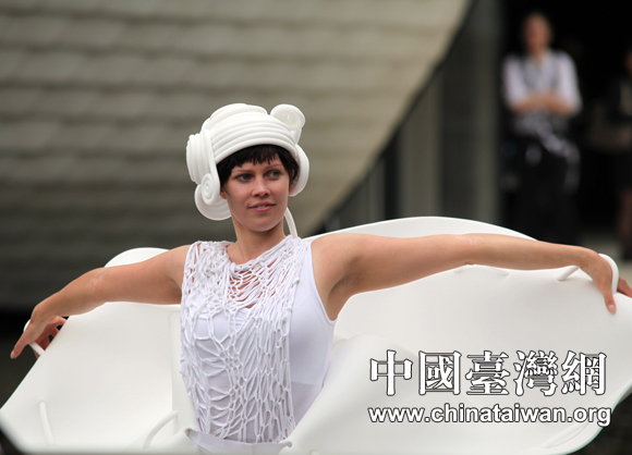 6月11日,上海世博园芬兰馆外,白色舞者为排队等候入馆的游客翩翩起舞,并不时与他们进行互动。在芬兰馆排队等候入馆也成为一种享受。 (中国台湾网 田云鹏 摄)