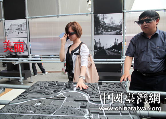 6月11日,两名游客在上海世博园德国馆外围参加体验项目——观众带上眼罩,“闭上眼睛看”城市,游客借助可触摸的城市模型,通过触觉、听觉去欣赏这些建筑和其所在的地区。(中国台湾网 田云鹏 摄)