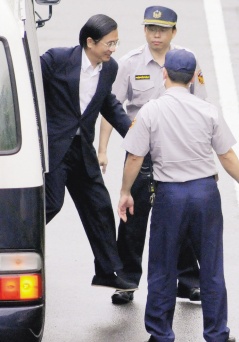 陈水扁走下台北看守所车辆,在警员监看下步入法院。图片来源:台湾《联合报》