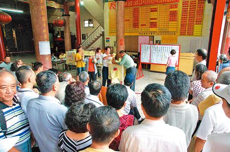 基层选举竞争激烈,彰化县员林镇玉天宫投开票所下午开票时,现场挤满关心选情的民众。 来源:台湾《中国时报》