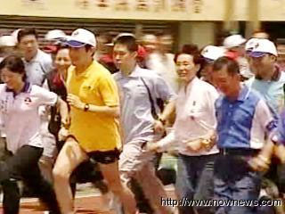 马英九短短两分钟就抵到终点,鼓励国民党党工们别忘多运动,马英九说,“两分钟跑完给两千(新台币 下同),如果林益世兄跑完给五千。”运动之余不忘调侃一下体型偏胖的林益世。(中国台湾网 陈佳慧)