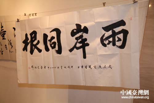 韩铁成书写的“两岸同根”(中国台湾网 李典典摄)