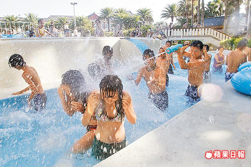 帅哥辣妹趁周末假日涌进水上乐园戏水消暑。图片来源:台湾《苹果日报》