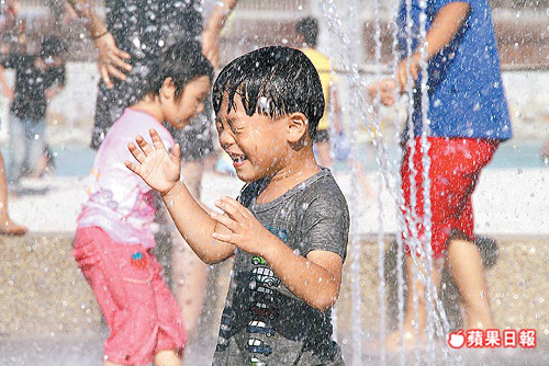 东石渔人码头免费开放供民众消暑,间歇性的喷泉让小朋友玩得不亦乐乎、惊呼连连。图片来源:台湾《苹果日报》