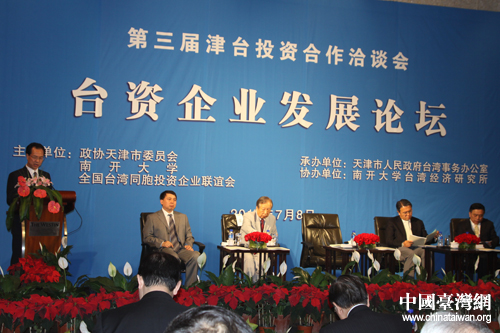 中国台湾网7月9日天津消息 7月8日下午,第三届津台投资合作洽谈会——台资企业发展论坛在天津君隆威斯汀酒店举行。与会两岸专家学者重点探讨ECFA签署后台资企业面临的新机遇、新空间,期冀为台资企业转型升级、拓展大陆市场提供借鉴。