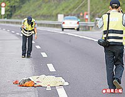 台湾昨天清晨,在某高速公路段一男子遭车祸,横尸路面头颅爆碎。图片来源:台湾《苹果日报》