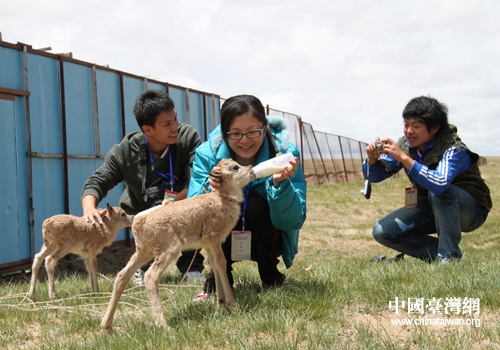 台湾大学生喂小藏羚羊(图片来源:青海省台办)