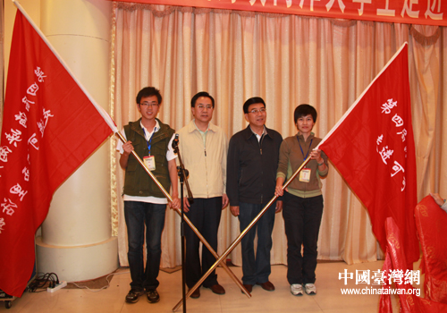 青海省政协副主席鲍义志、省台办解小平主任与两地学生旗手合影(图片来源:青海省台办)