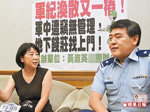 “立委”黄淑英(左)踢爆台空军10名军人证件被冒用贷款5万。台军空军张建欧副主任(右)称已惩处。图片来源:台湾《苹果日报》