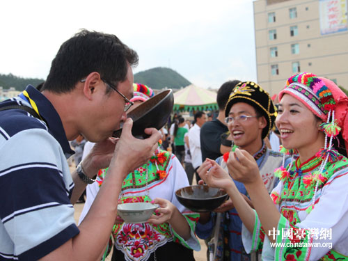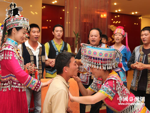 热情好客的壮家人敬酒方式也很特别。(云南省台办 李仁兴 摄)