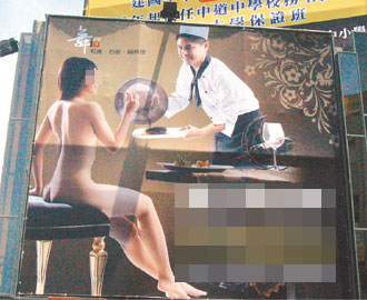 宜兰市一家餐厅用裸女照广告,虽然很吸晴,但是在民风保守的宜兰引起议论,广告中的裸女是名护专生。 图片来源:台湾《联合报》