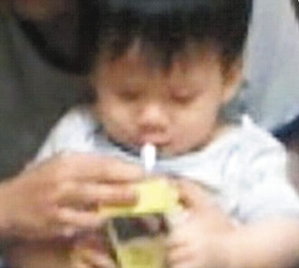 大人怀抱年约一岁的幼儿,把没点燃的烟塞到男婴嘴里。来源:台湾《联合报》
