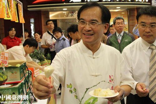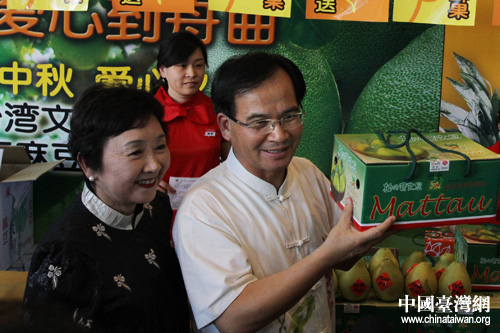苏焕智及太太向民众推荐麻豆文旦柚。(中国台湾网 程轶文 摄)