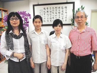 陈淑玲(右二)今年读桃园县振声高中进修部二年级,三年级的女儿吴宜柔(左二)是妈妈的“学姐”,校长张湘君(左)勉励她们用功读书。 来源:台湾《联合报》