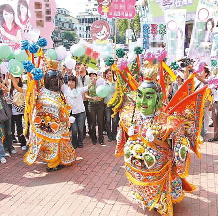 参选人还请来电音三太子助阵。来源:台湾《中国时报》