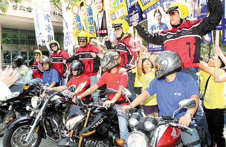 新党市议员参选人集体乘坐重型摩托车抵达现场造势。来源:台湾《中国时报》