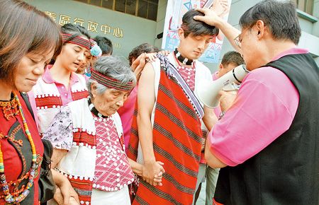 在台北市选委会外,有台湾少数民族市议员参选人身着传统服装,在耆老与族人的陪同下前往登记。来源:台湾《中国时报》