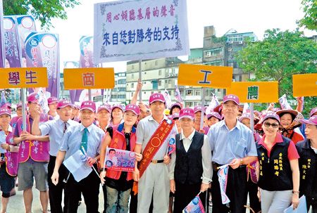 寻求4连霸的台北县议员周胜考(中),在士农工商及学生等代表陪同下,一同前往台北县选委会登记参选新北市议员。来源:台湾《中国时报》