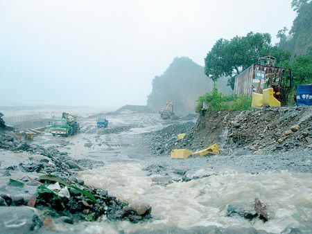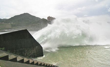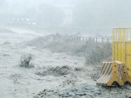 高雄县荖浓溪水暴涨,湍急溪水漫过六龟大桥便道,无法通行。来源:台湾《中国时报》