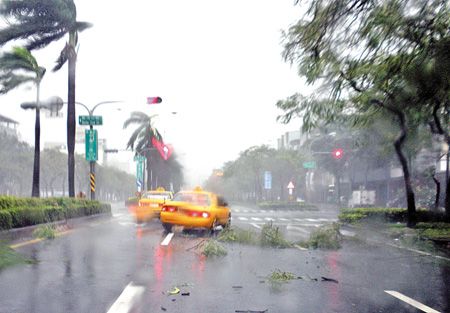 被凡亚比台风吹断的路树横在路中,汽车以S型行驶闪避,险象环生。来源:台湾《中国时报》
