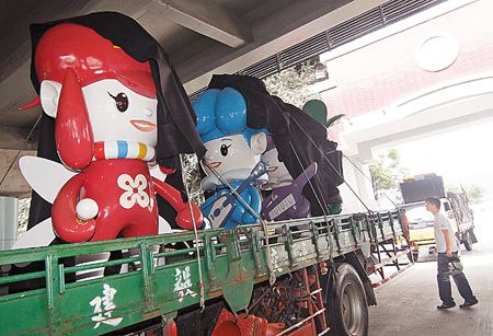 连花博吉祥物,也由货车运送到滨江街的暂置区躲避台风。来源:台湾《中国时报》