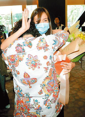 莎莎(左)22日返台,母亲赶紧送上猪脚面线压惊。 来源:台湾《联合报》