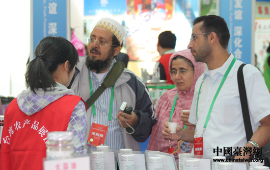 阿拉伯客商参观台湾商品展,品尝台湾特产。 (中国台湾网 王伟 摄)