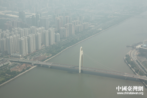 从广州电视塔顶端俯瞰珠江,沿岸美景尽收眼底。(中国台湾网 赵辉 摄)
