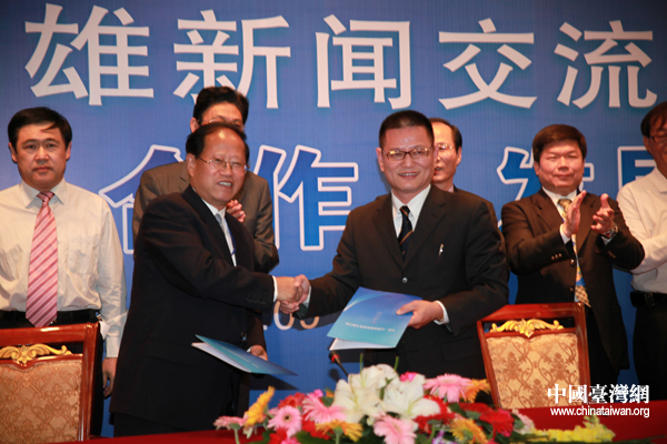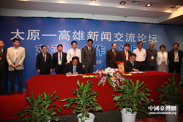 太原市新闻工作者协会主席黄征与高雄市新闻记者公会理事长马道明共同签署“四点共识”。 (中国台湾网 田云鹏 摄)
