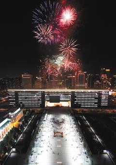 台中市新市政中心昨晚举行点灯仪式,新市政中心灯火通明与璀璨焰火互相辉映,照亮台中市夜空。来源:台湾《联合报》