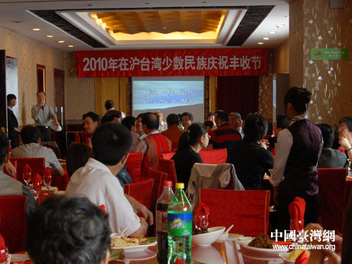 10月10日,上海市台联举办2010年在沪台湾少数民族丰收节联谊活动,在沪的台湾阿美族、排湾族、泰雅族、平埔族等少数民族家庭20余户50余人参加了隆重的丰收节庆祝活动。图为活动现场。(上海市台联 王茜 摄)