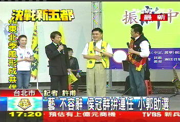 中国台湾网10月18日消息 综合台湾媒体报道,台湾“五都”(台北县升格后的新北市、台北市、县市合并后的大台中市、大台南市和大高雄市)选举倒数最后一个多月,参选人纷纷成立总部造势,平常不沾政治的艺人,也纷纷出马帮助自己的好友。台湾模仿天王郭子乾为郝龙斌打气,他发挥自己的模仿搞笑能力,扮演苏贞昌“自贬”来抬高郝龙斌;台湾综艺天王吴宗宪也为国民党台北市议员参选人洪士奇站台,人气之高甚至压过同样到场的宋楚瑜。