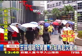 据台湾TVBS电视台报道,今天,王菲台北演唱会开始正式售票。因为购票的歌迷太多,售票网络出现拥堵,台湾各实体售票口也出现排长队买王菲演唱会门票的人潮。歌迷们表示,不管刮风下雨,他们都要来排队,因为等的太久了。然而,10月4日到8日的信用卡预购,已经有1万张王菲台北演唱会门票销售一空,目前只剩下2万张。