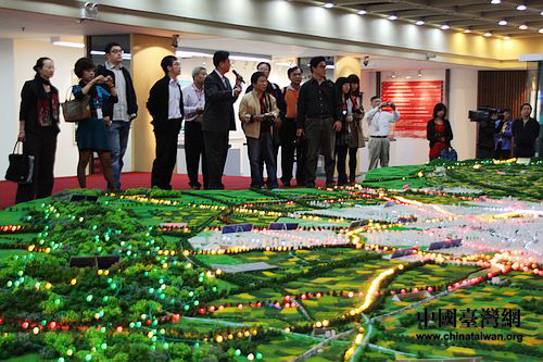 记者们站在成都市城乡规划总模型前兴致勃勃。(中国台湾网 马迪 摄)