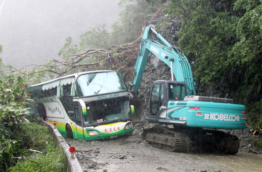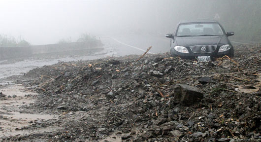 台风“鲇鱼”所带来的强风豪雨致苏花公路严重塌方,不少车辆遭崩落的土石砸毁 图片来源:台湾《联合报》