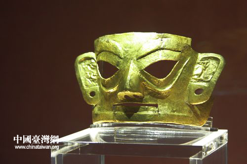 高11厘米、宽19.5厘米的黄金面具,是迄今大陆发现的保存最完整、最大的一件金面具。它陈列于金沙遗址博物馆的“千年绝唱”精品文物厅中,与“太阳神鸟”互相辉映。(中国台湾网 马迪 摄)