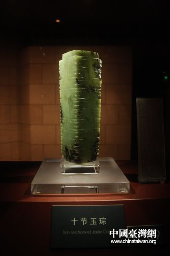 十节玉琮。由一块质地细密的上佳整玉雕琢完成,通体呈淡青绿色,九条细小的横槽将器身分为十节,每节棱角上均刻有纹饰。有专家认为,此玉琮比金沙遗址更早1000年。(中国台湾网 马迪 摄)
