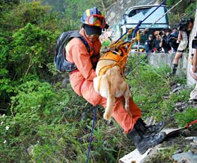 台北县搜救队副队长吴宏益说,前天带来的2只搜救犬,由队员抱着垂降300米左右执行搜救,但狗儿过度惊慌,加上斜坡至少70度,狗儿吓得连站都站不稳,“一紧张,就发挥不了功能,今天就不带出门了”。